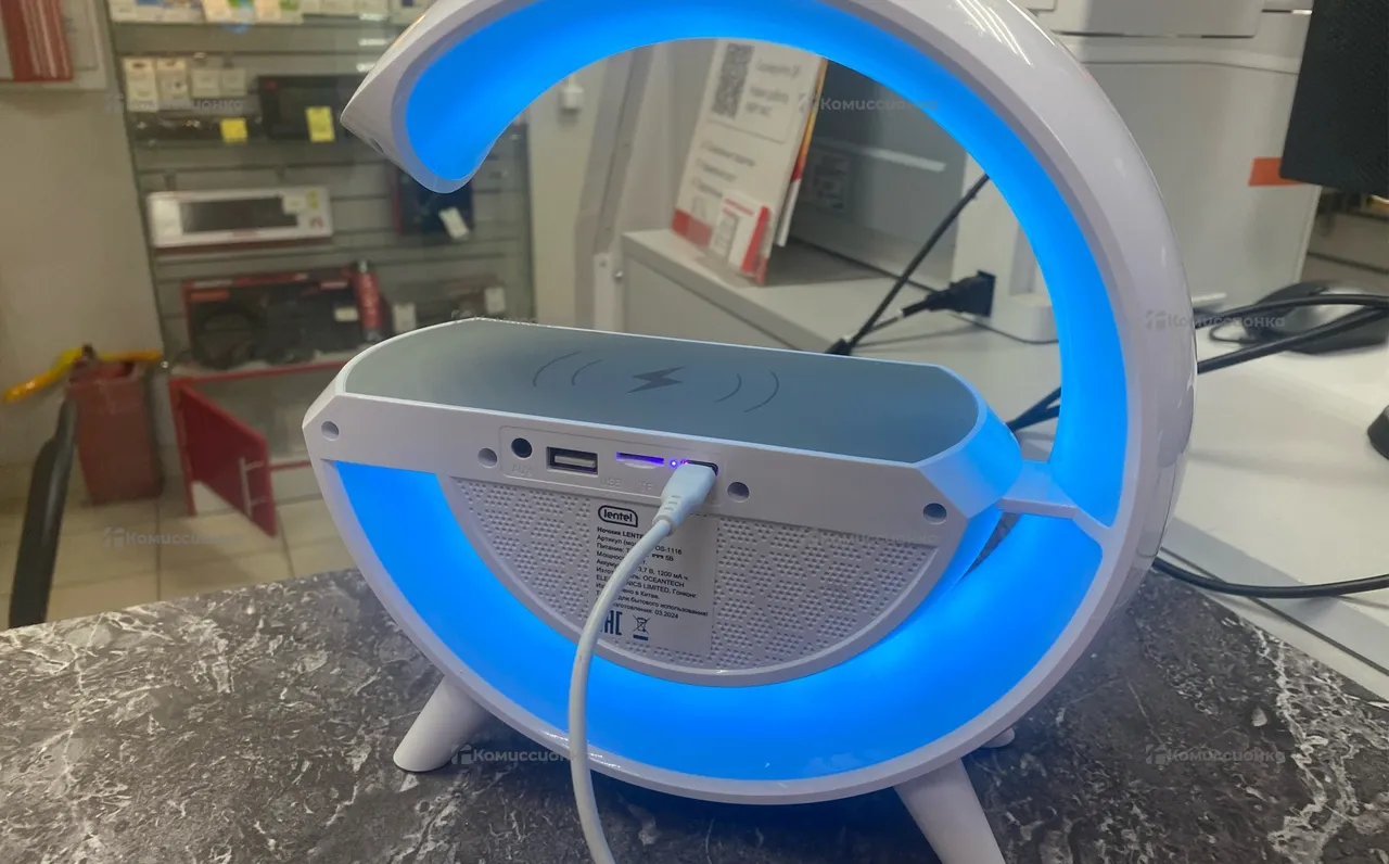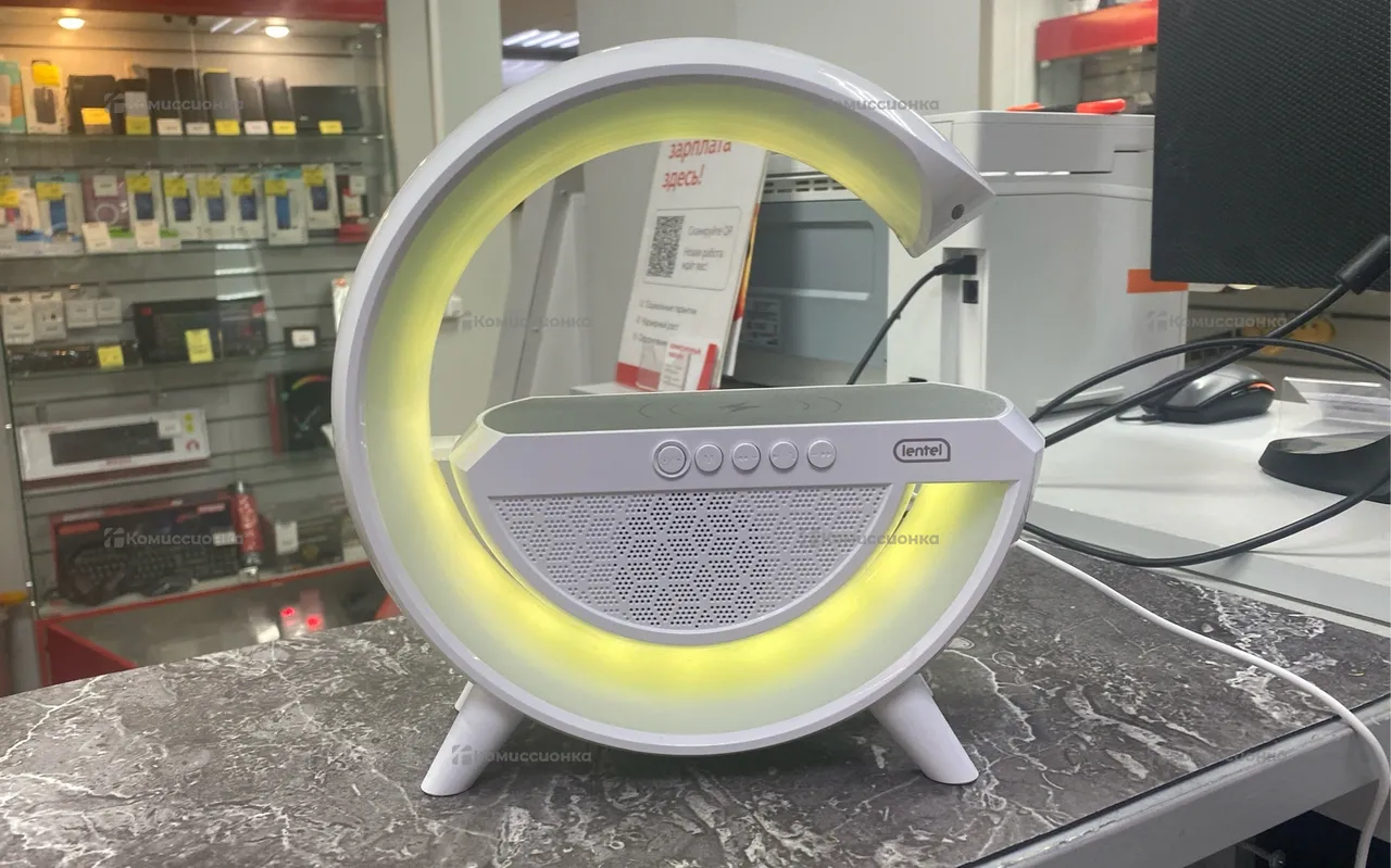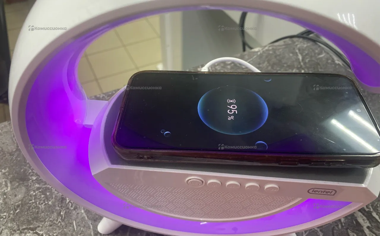 Стильная беспроводная колонка с bt, радио, проигрывает с флешки, имеет подсветку, да еще и беспроводную зарядку для телефонов
